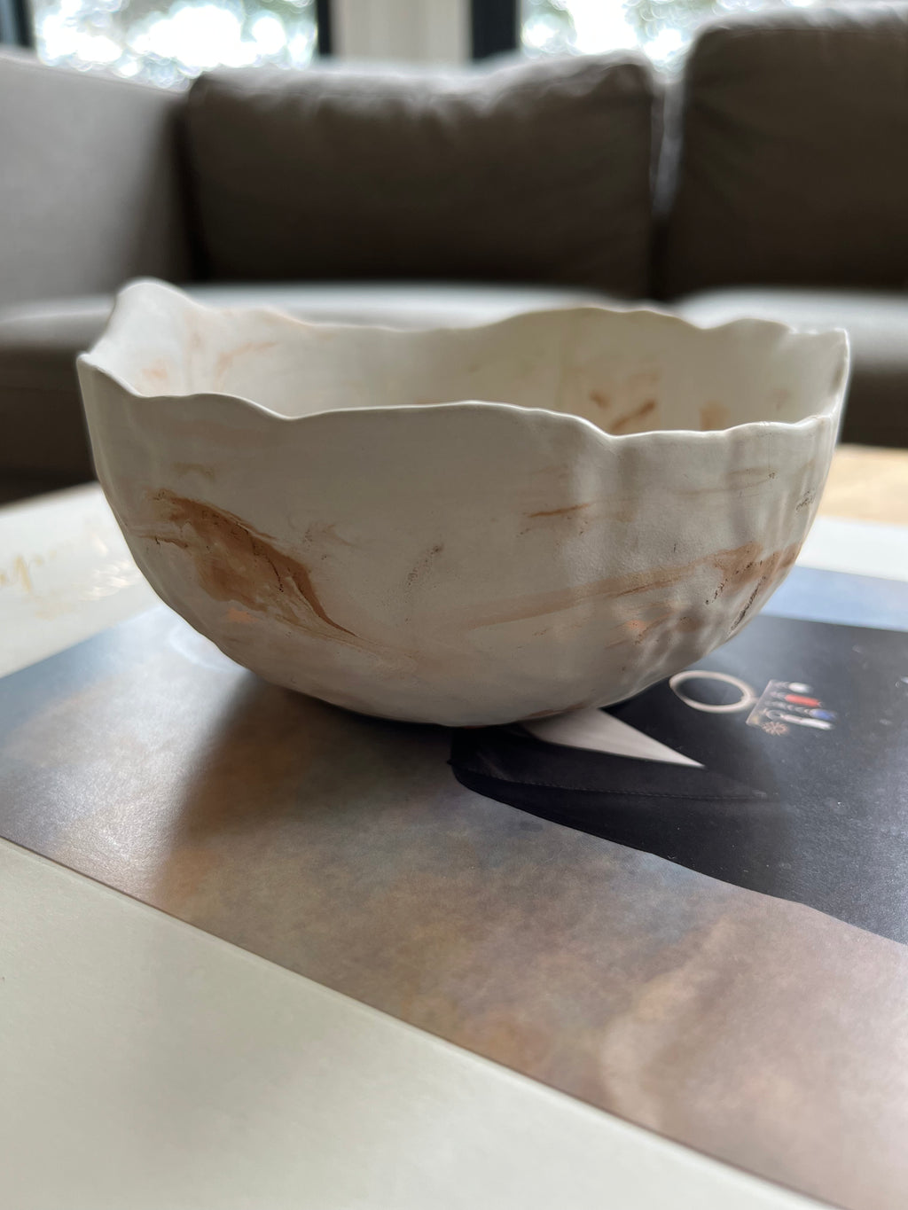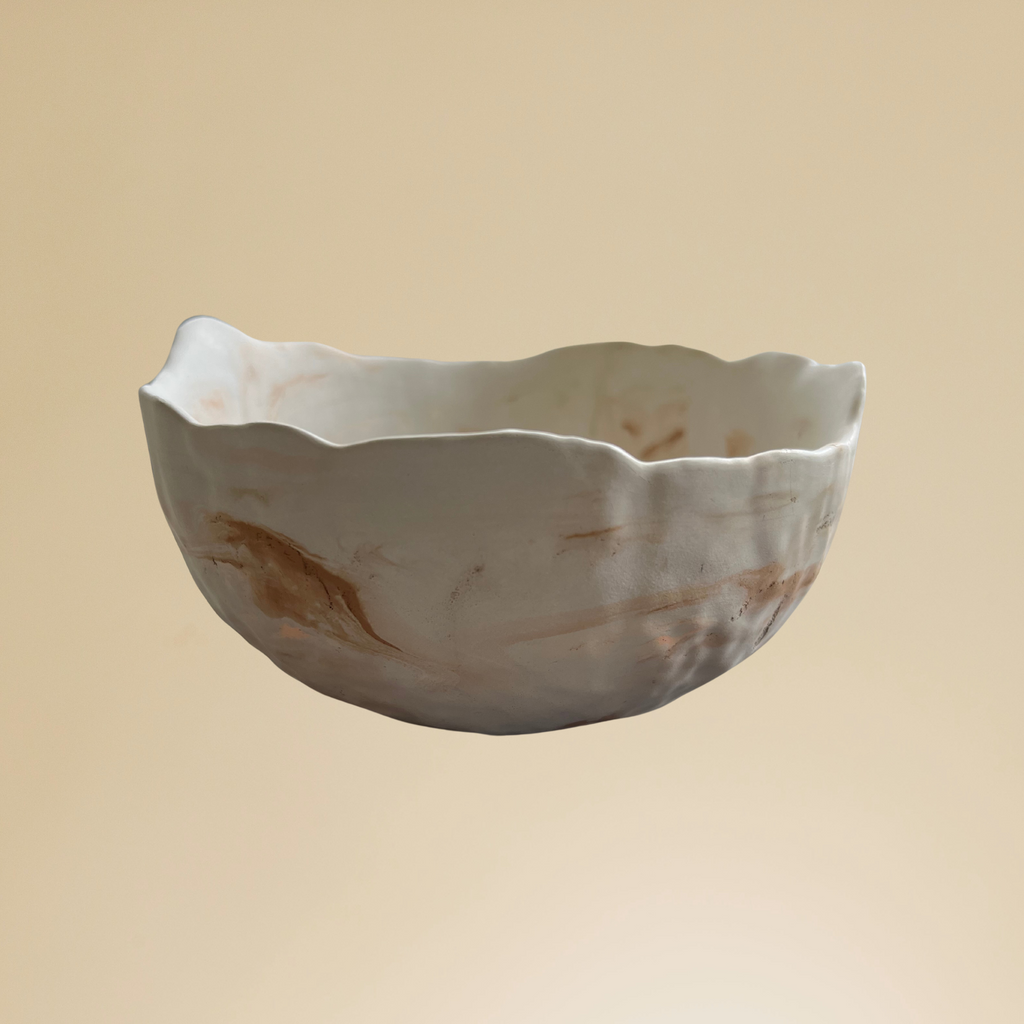 The Daso Bowl - a textured bowl with uneven edges, crafted meticulously from concrete. Its surface boasts a captivating texture, with organic irregularities that add character and charm to its design. Each edge is unique, reflecting the artisanal nature of its creation. This bowl is not just a functional piece but also a work of art, perfect for adding a touch of elegance to any space.