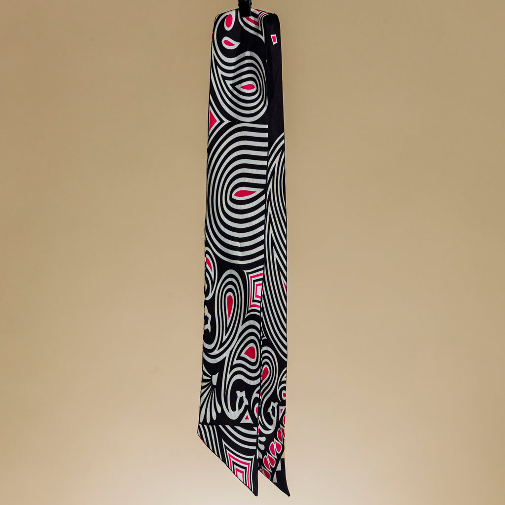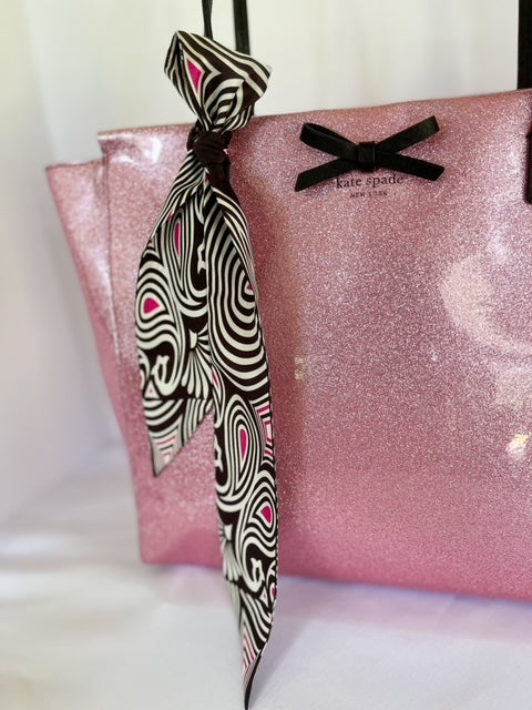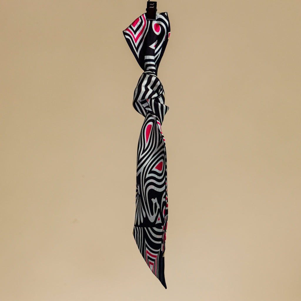 Every now and again you need a little pop of color to add to your outfit. This bright silk Embrace Your Magic twilly is pretty--just like you and is the perfect way to add pop to an outfit! With black and white stripes and a pop of pink, you can tie it around your neck, wrap it around your wrist, wear it on your head, tie it onto a purse handle .