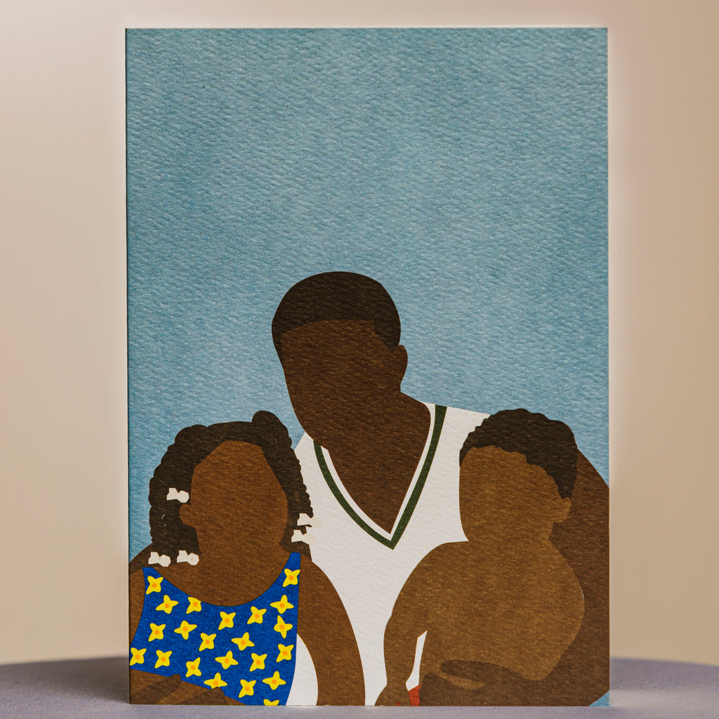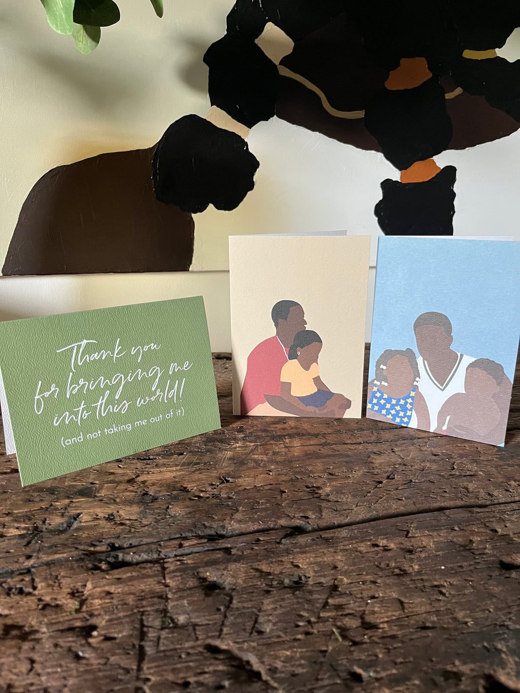 This is the Kinfolk series, which includes illustrations of family life. Card No. 3 features two small children pictured with their parent and was designed by SaVonne Anderson, Founder and Creative Director of Aya Paper Co. Interior is blank for you to write your own message.