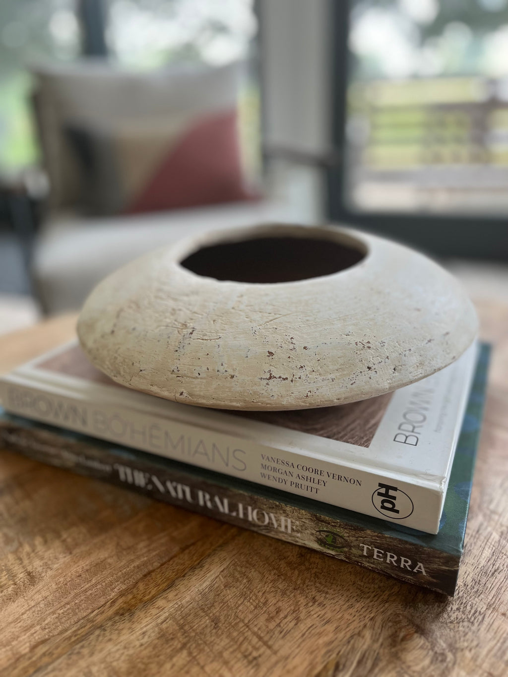 A perfect centerpiece and one of a kind vase, the sandollar vase sits beautifully alone or placed with trinkets in it. Comes in a smoky beige color capturing the look of found antiques. Each individual piece is handmade with love in Tonala-Mexico and has unique imperfections. These include but not limited to slight differences in colors, pits, spots, and dimensions. Please note: our clay vases are handmade by artisans, and they are styled best as decorative pieces. Do not add water to the vase as it is composed of clay and will cause damage.