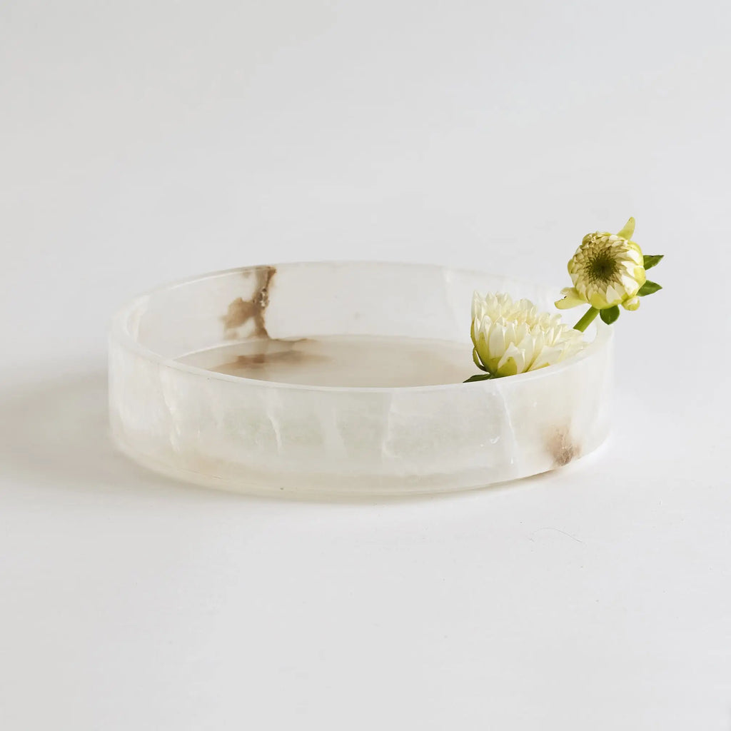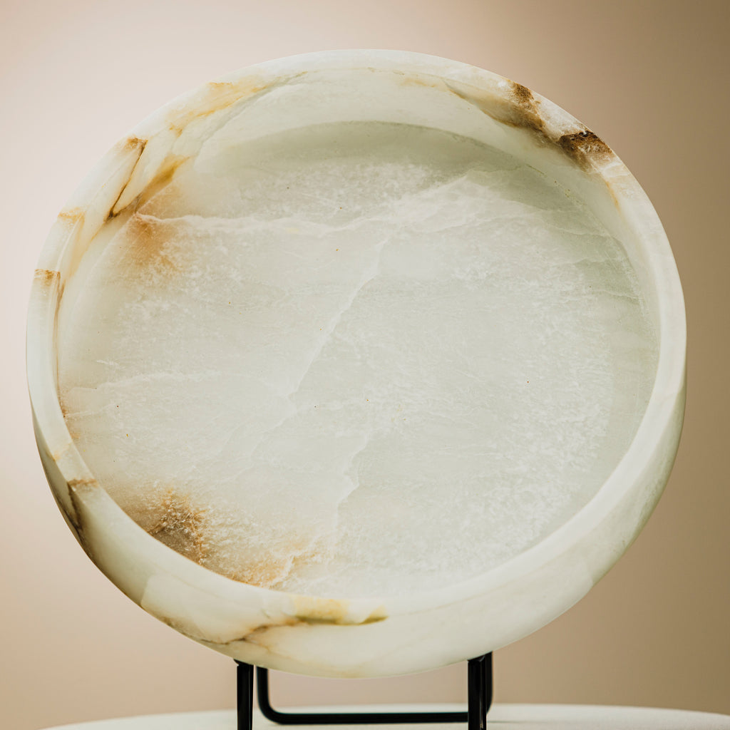 Handcrafted from fine Portuguese alabaster, this chic round tray will add a spa feel to your bath or bedroom with its simple beauty. A hand-polished finish accentuates unique natural color variations in the stone, making each tray different from the others. A stable, footed base and vertical rim safely contain and stylishly display its contents.