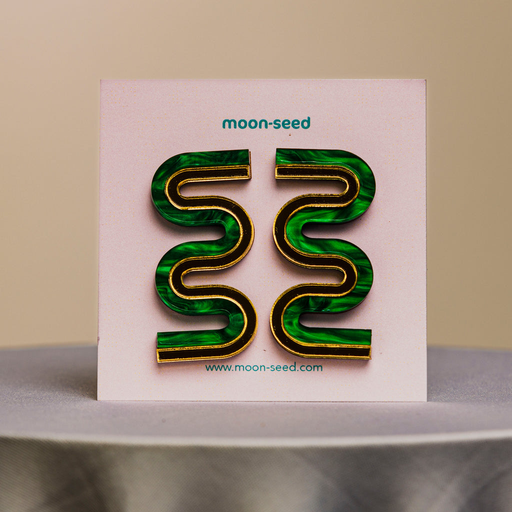A pair of bold squiggle statement earrings. Moon-Seed is all about creating art for your ears. Statement earrings designed with a fun bold play on circular forms, geometric shapes, classic art movements, Caribbean vibes, and colorful patterns.  Due to the handmade nature of these items, patterns and colors may vary slightly from one pair to the next, making each piece incredibly special and unique.